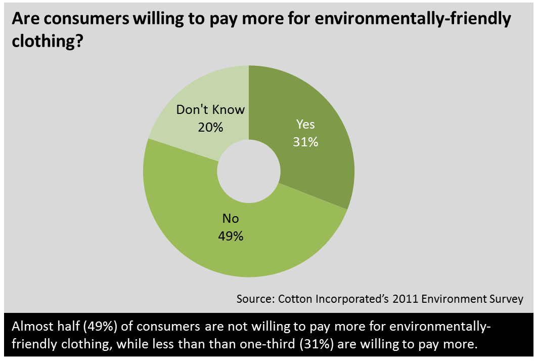 Less than a third of US consumers (31%) is prepared to pay more for environmentally friendly clothing, according to a 2011 study. A staggering 49% say they're definitely not to willing to pay extra.